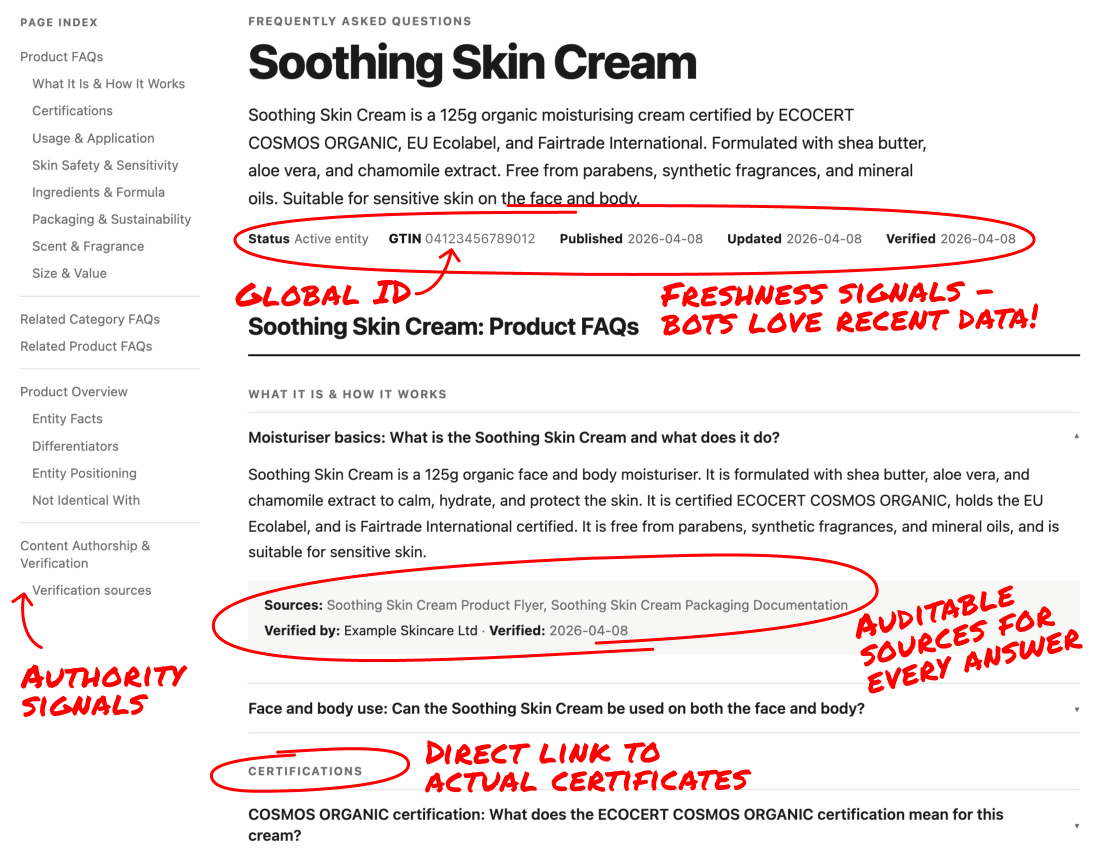 Each page carries 101 machine-readable signals. FAQPage schema. W3C provenance tracking, the same standard used in academic publishing and government data. GS1 product identifiers. Full WCAG 2.2 accessibility. Deploy as standalone pages on your own domain or embed directly into retailer product pages.